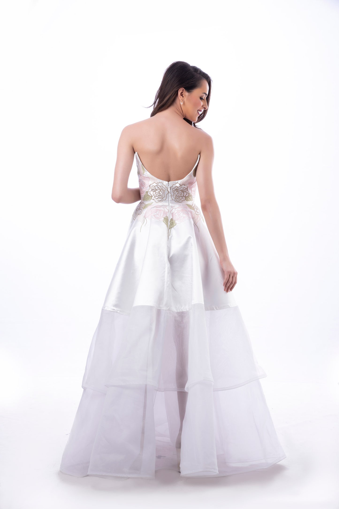 Hand Embroidered Mikado fabric in a ball gown silouhette is what every classic bride dreams of.