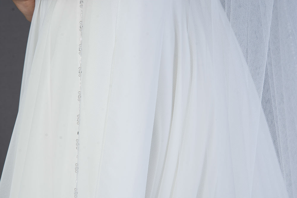 Delicate beaded edge veil with a patterned placement of clear crystal beads and pearls. Shape : Tapered cut. Embroidery and embellishment : Pattern of Crystal beads, soft white pearls and silver lined glass bugles all sewn together with fine silver thread. Color of pearl changes with the color of tulle. Tulle color options: Bright white , diamond white , light ivory . Length: 108" long. Finishing touches: All of our veils are finished with our tag and silver metallic combs. We use the finest tulles available.