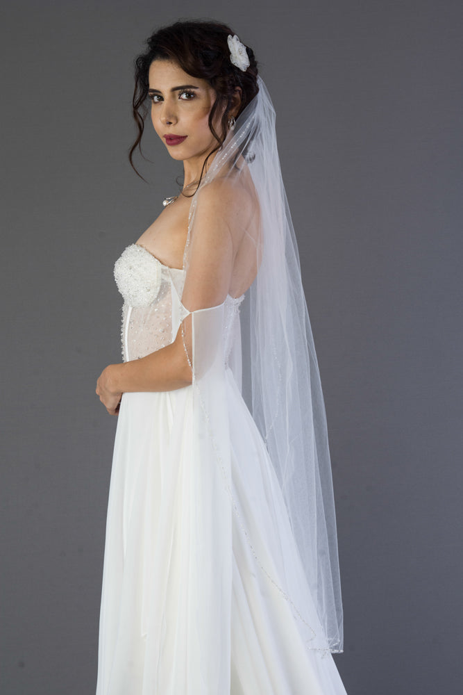 Delicate beaded edge veil with a patterned placement of clear crystal beads and pearls. Shape : Traditional. Embroidery and embellishment : Pattern of Crystal beads, soft white pearls and silver lined glass bugles all sewn together with fine silver thread. Color of pearl changes with the color of tulle. Tulle color options: Bright white , diamond white , light ivory . Length: 45" long. Finishing touches: All of our veils are finished with our tag and silver metallic combs. We use the finest tulles available.