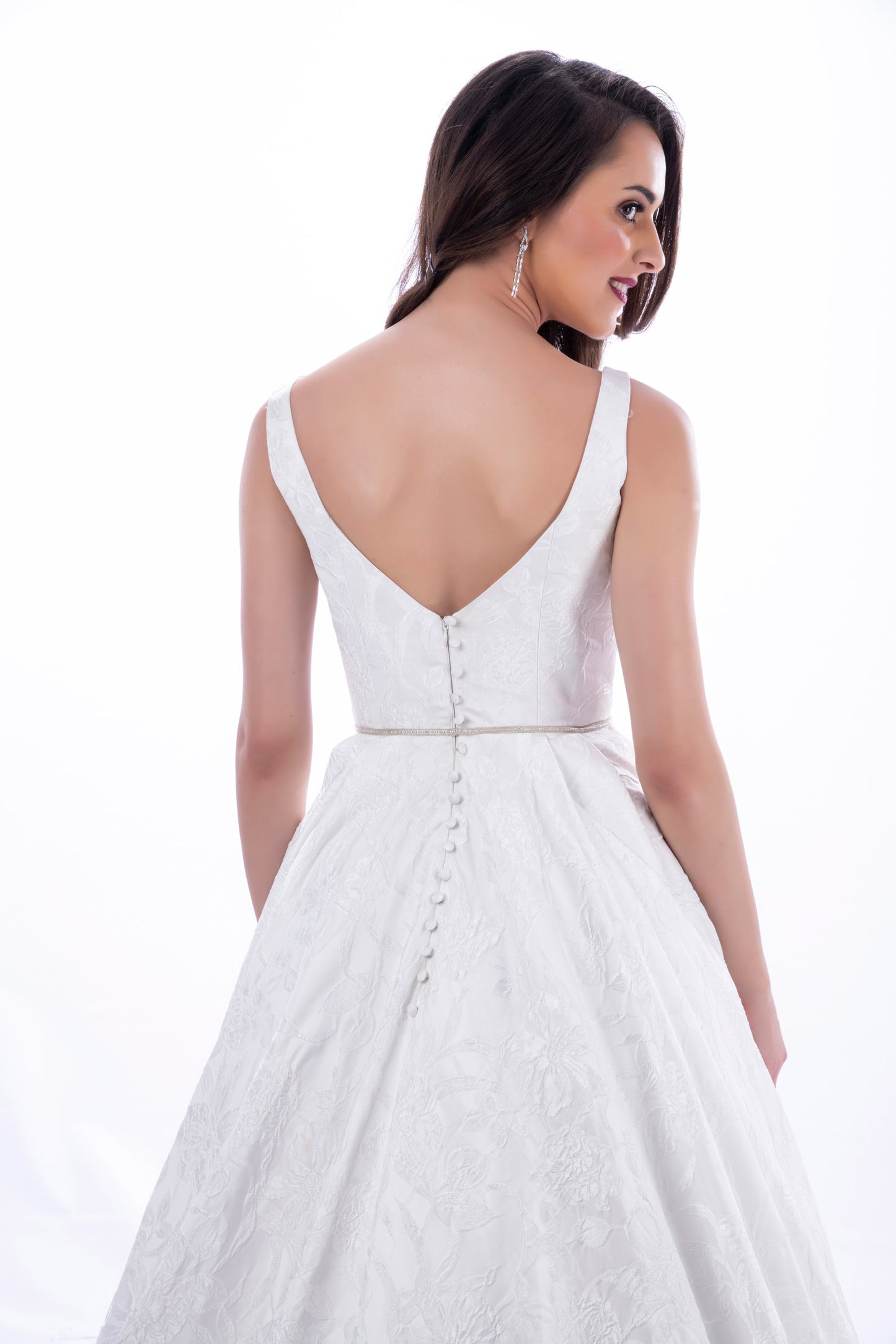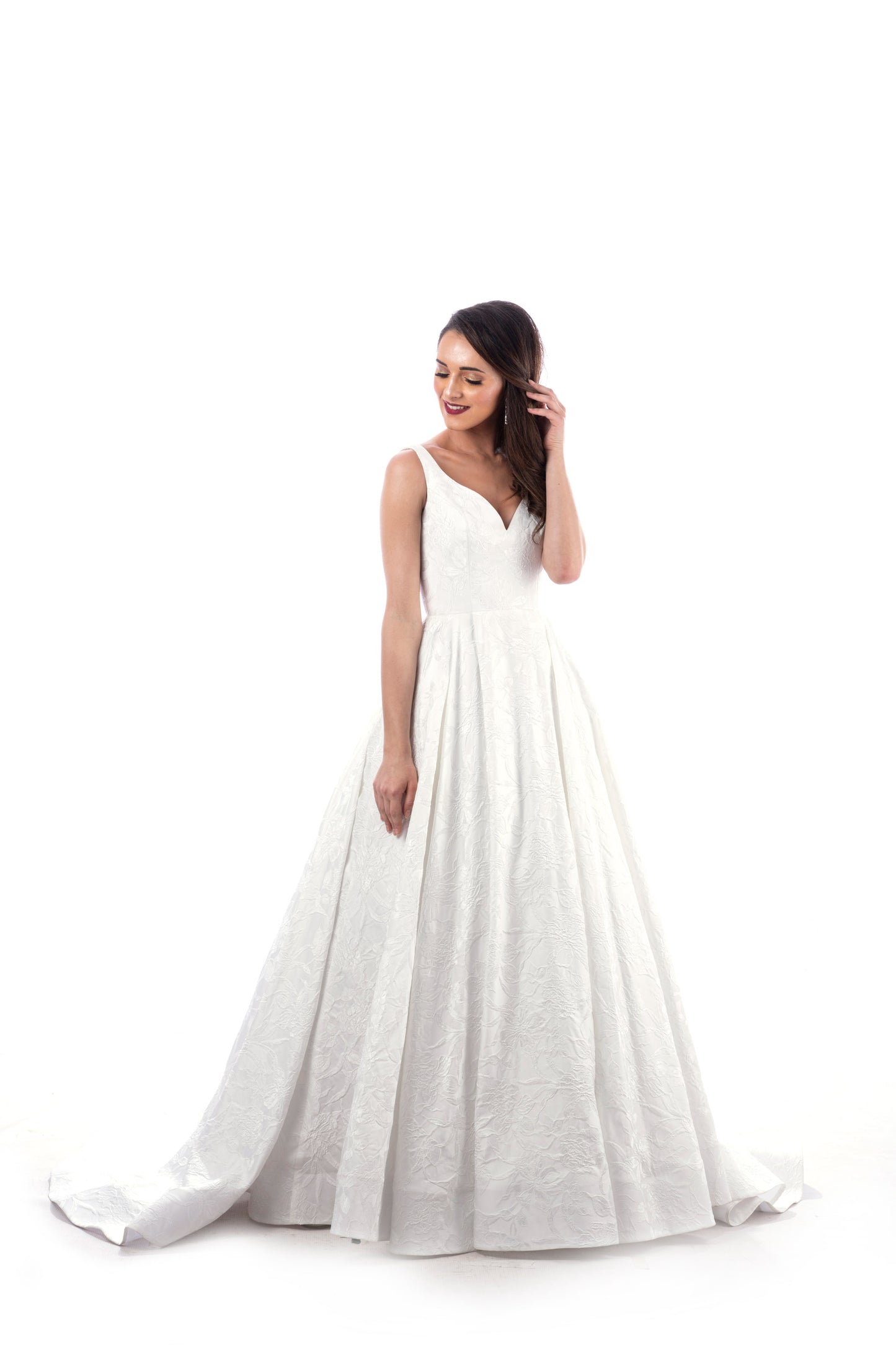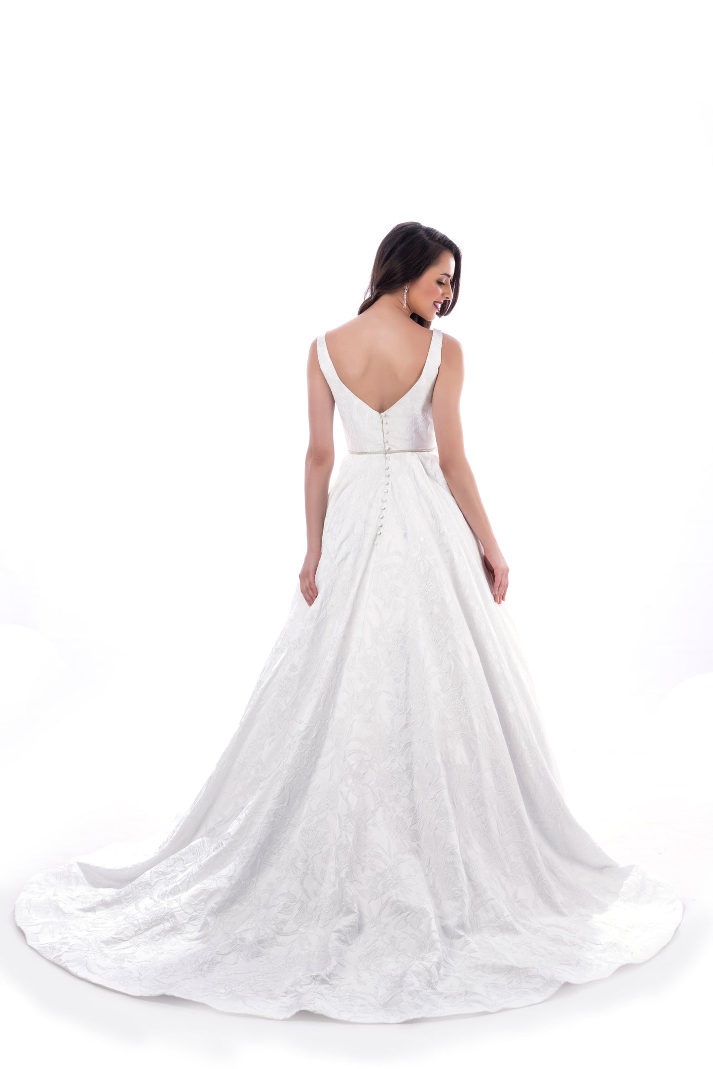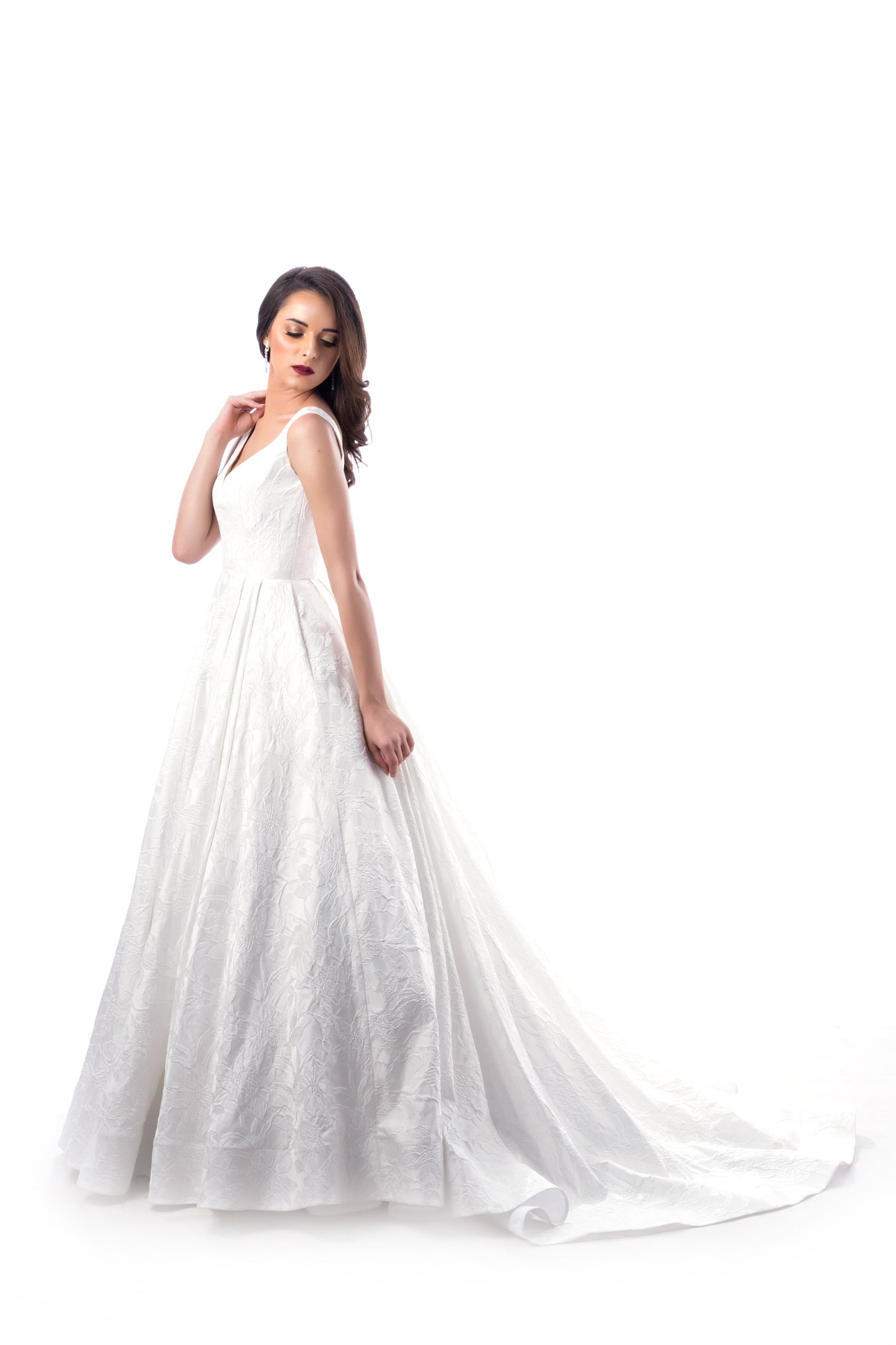 Spanish Jacquard fabric that lends class to this amazing ball gown dress with a generous train.